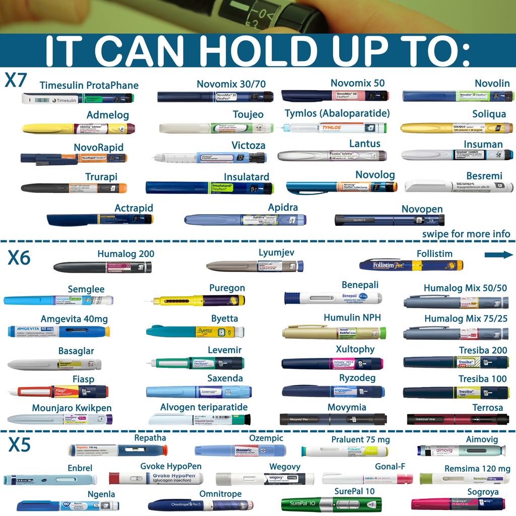 Nuestras soluciones de transporte en frío se adaptan a todos los tipos y marcas de insulina: Admelog, Afreeza, Apidra, Basaglar, Fiasp, Humalog, Humulin, Lantus, Levimir, Lyumjev, Novolin, Novolog, Novorapid, Ryzodeg, Toujeo, Tresiba, Velosulin, Xultopy...