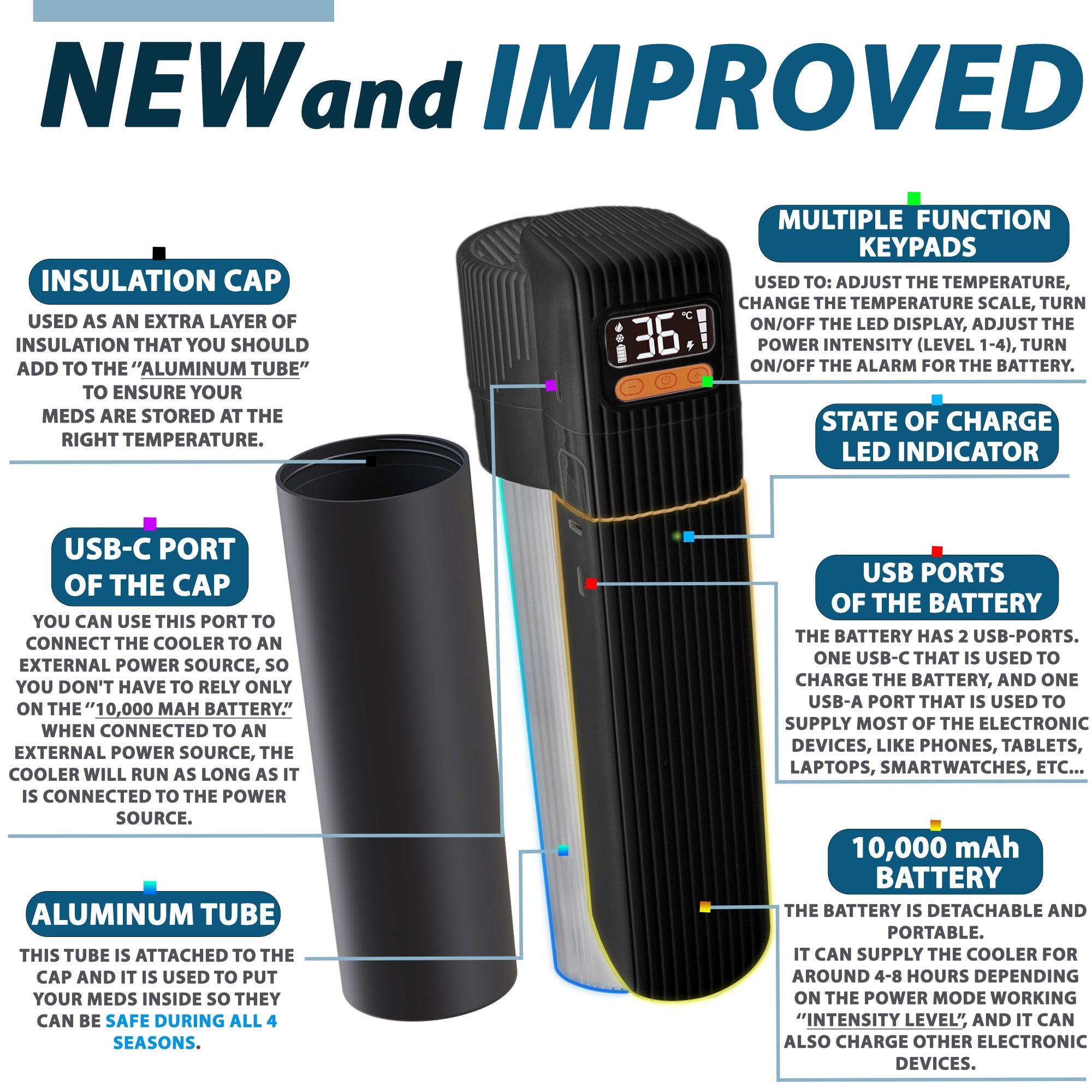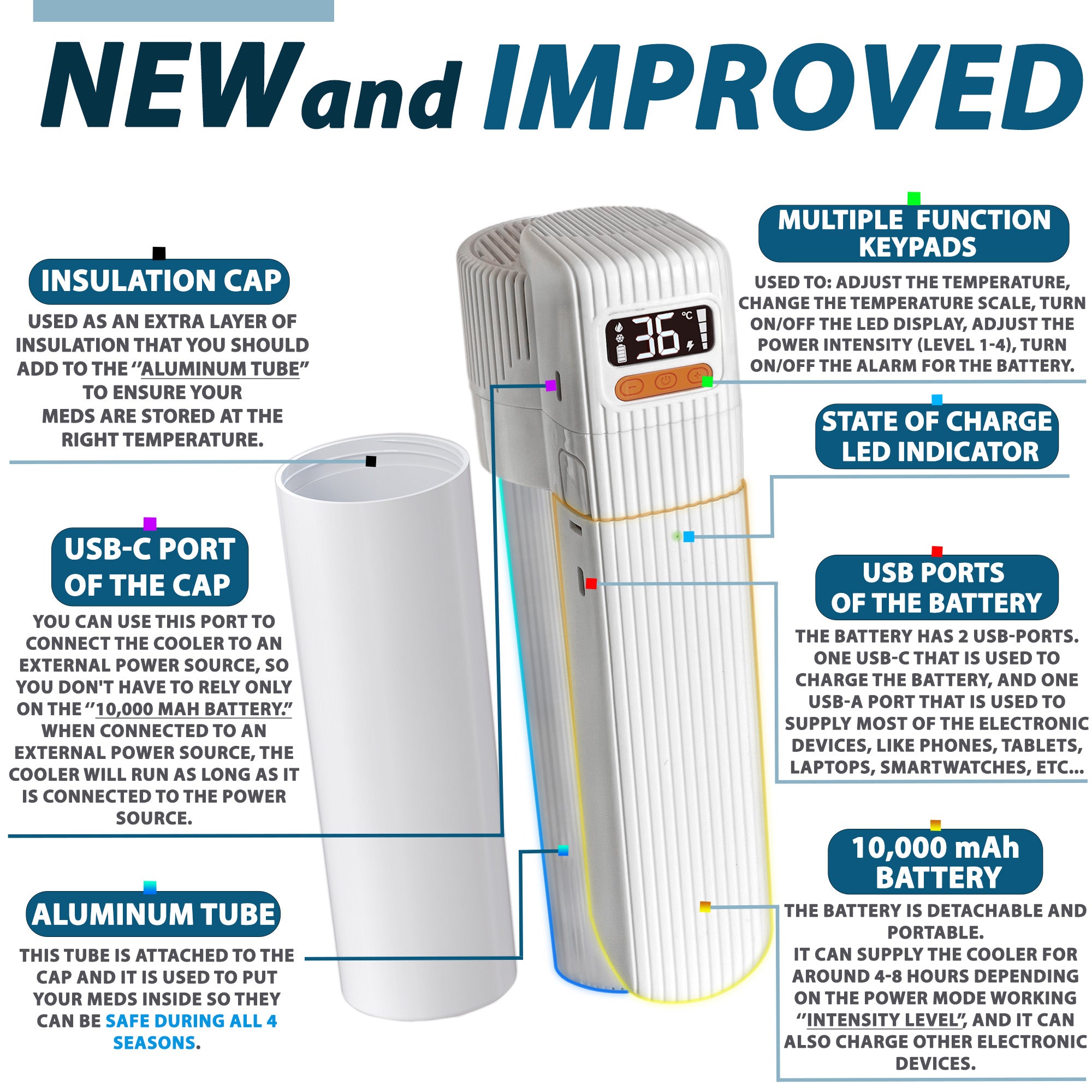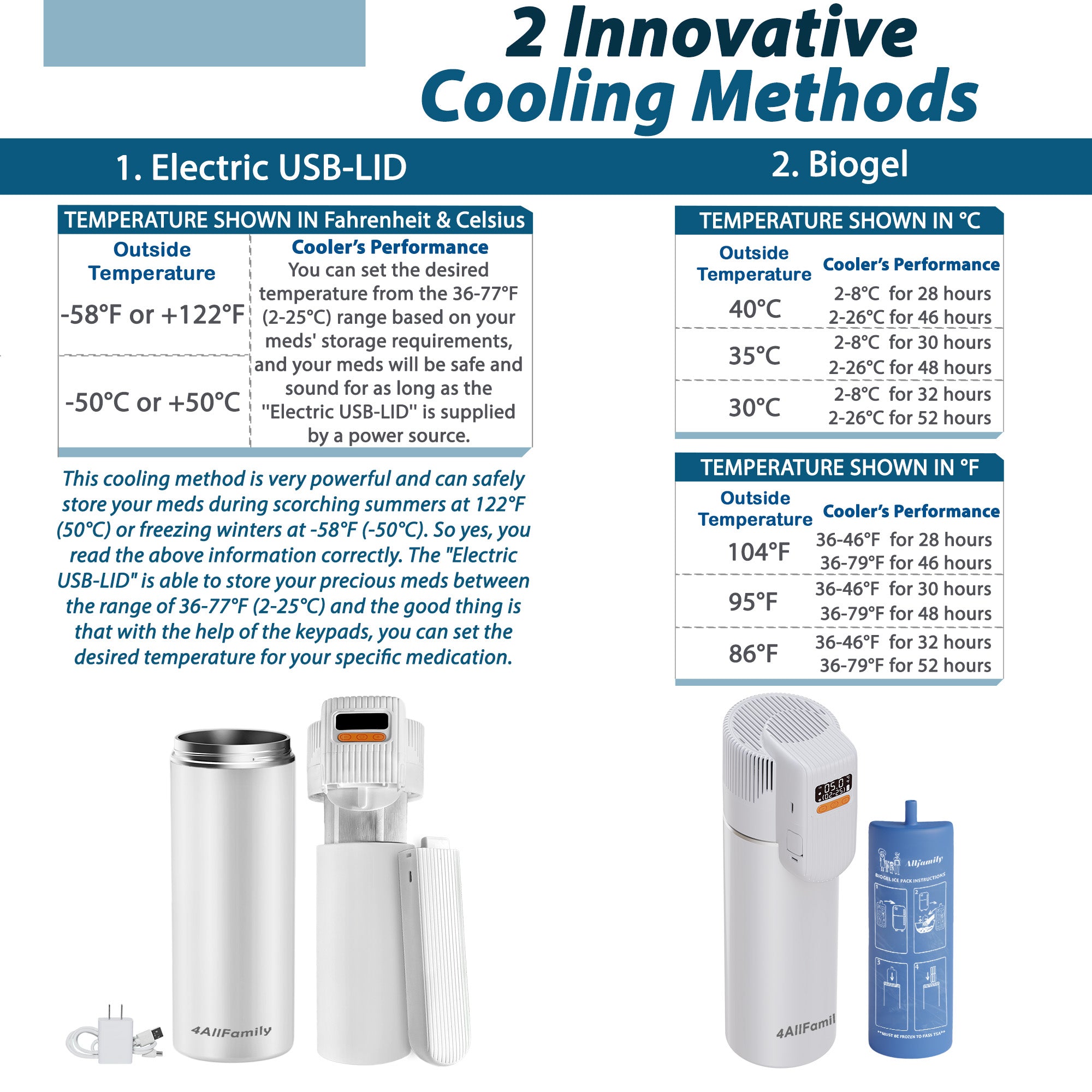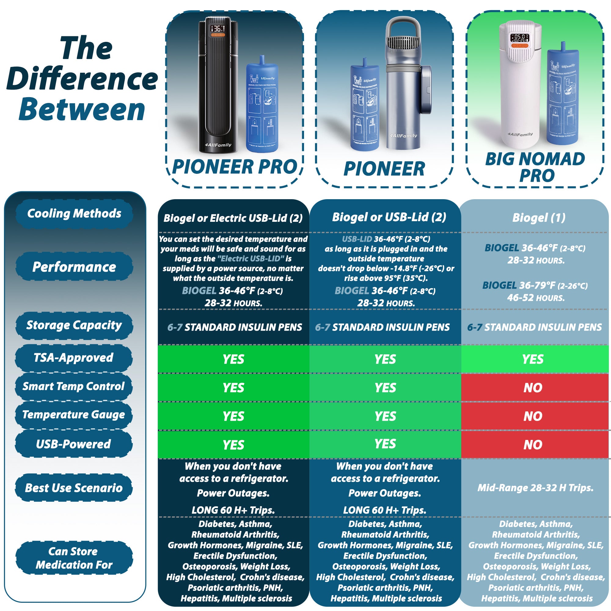 The 4ALLFAMILY Pioneer PRO insulin cooler travel case is a premium, travel-ready medication and insulin cooler designed to keep your temperature-sensitive medications at a safe, consistent temperature during travel. Whether you need to transport insulin pens, GLP-1 meds, epinephrine pens, or other biologics, this insulin travel case TSA approved ensures your medications are stored properly for hours, thanks to its innovative USB-powered active cooling and biogel passive cooling system.